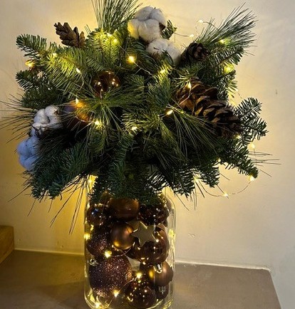 This arrangement is fixed to the top of a vase filled with Christmas baubles which are available in a variety of colours. All materials, including the vase are included in the price.